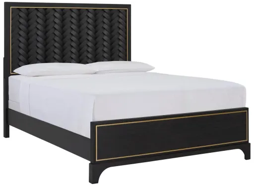 Make a statement without saying a word with the Elizabeth queen bed. This dramatically striking piece pairs bold texture with tailored detailing for a look that’s timelessly on-trend. The headboard showcases a woven pattern that adds depth and dimension to create a rich focal point in the room. Framed in a deep black finish with subtle metallic trim, it balances artistry with clean-lined structure. The refined finish, spade feet, and understated inlays set an exquisite tone for the room.