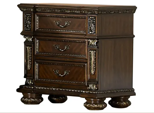 Old-World European styling is captured in the dramatically elegant Elsmere nightstand. Traditional design elements reign at every turn - egg and dart molding, acanthus leaf carving, bead molding, gold tipping and extravagant carvings - creating a sophisticated look for your bedroom. Each drawer front features antiqued brass fixed-drop hardware with decorative flourish that furthers the elegant appointments that embellish this collection. A traditional cherry finish is utilized to highlight the cherry veneer of the set and decorative inlay patterns found on the top.