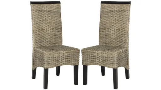 Rich in designer details, this transitional Ember set of two grey wicker dining chairs adds a luxury look to dining rooms, kitchens and casual spaces. Crafted of rattan with contrasting legs and accent bands on seat backs of hardwood in a dark mahogany finish.
