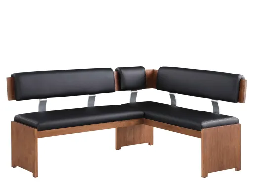 Add instant modern flair into any dining or living space with this Emma Upholstered Nook. Look no further than the solid wood frame in a walnut veneer finish and black faux leather upholstery to bring warmth and high-design into the home. Great for smaller spaces without giving up comfort and functionality.