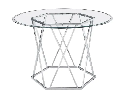 Dine-in in style with the Escondido dining table. It features a round tempered glass tabletop sitting on an X-shaped metal base. This table modernizes and creates a sleek and sophisticated look to your room instantly.