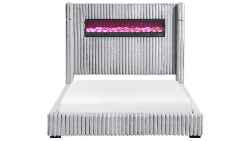 This stunning Eva Bed redefines bedroom luxury, blending sophisticated design with modern functionality to create your ultimate retreat. The plush corduroy fabric upholstery, coupled with a striking wingback headboard, exudes contemporary elegance. The true centerpiece is the integrated remote-controlled electric fireplace, offering a mesmerizing ambiance with 5 levels of brightness and 13 vibrant color options, all while you enjoy your favorite tunes through the built-in speaker. Supported by a durable engineered wood frame and stylish solid wood bun feet, this bed isn't just a place to sleep—it's an experience, transforming your bedroom into a cozy, captivating sanctuary.