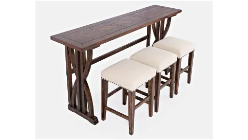 Distressed Acacia wood and a curved pedestal base combine functionality and style in the Fairview Dining Set. This four piece set includes three padded backless barstools and one counter height sofa table and brings great additional seating in the living room while entertaining or watching television, or as a kitchen table in smaller spaces. The cross-beam style combined with a trestle for support can be placed against a wall or the back of a couch, and the barstools have a plush Cream fabric finish with a built-in footrest. Available in Oak and Ash finishes.