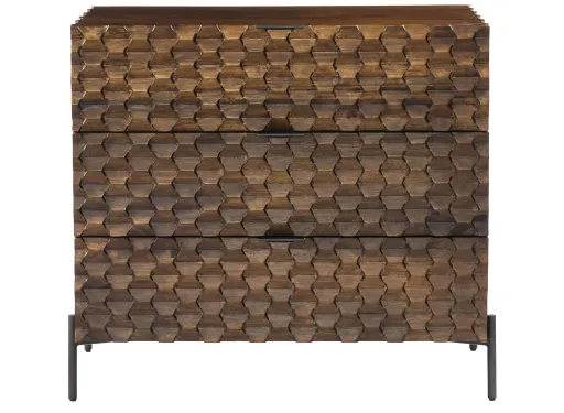 A spacious three-drawer dresser of antique brown-finished mango features intricate carving for a uniquely textured look. Aged iron legs offer an intriguing material mix with a modern touch.