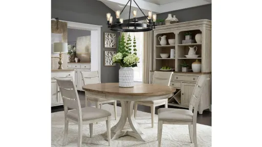 Farmhouse reimagined 5-pc. pedestal dining set with leaf offers cottage style you love in a heavily distressed finish that will work from the beach to the mountains to an industrial loft. Vintage can refer to "a classic," add in a relaxed style and you create a classic look with a casual feel. Looks that easily work in today's homes. Style uncompromised with comfort abound.