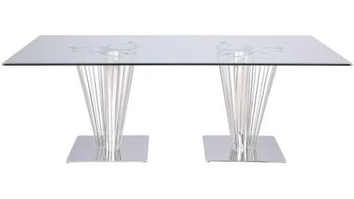 Add a contemporary feel to any dining area with this tempered Fernanda glass dining table. Supported by a matching pair of imaginative multi-point polished stainless steel pedestal bases, each with a sturdy, circular floor plate.