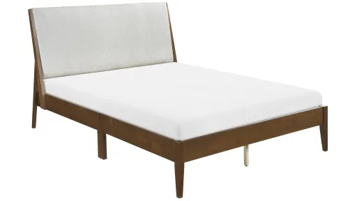 The Finley Platform Bed features a chestnut finish, its warm hue a perfect complement to the light gray chenille fabric upholstered headboard. Subtle Mid-Century Modern inspiration drives the design and lends a classic profile to the modern lines of the Finley Collection.