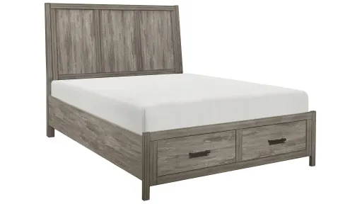 Following the trend of rusticated simplicity is the Fontaine Bed. Melamine laminate perfectly mimics the look of gray weathered wood, lending to the rustic style. The transitional framing of the bed allows for placement in myriad bedroom settings, creating the perfect canvas for your preferred decorative style. Black metal bar hardware fronts the drawers of the storage footboard, providing complementing contrast to the gray finish.