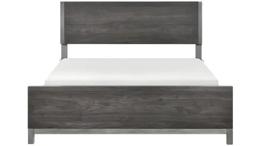 The sleek design of the Frado Bed pairs clean lines with modern convenience to create a style that will be the perfect palette for your design aspirations. The low-profile panel bed features painted metal-finish banding on the headboard's sides and the footboard's base rail, creating the perfect accenting contrast to the faux wood finish of the melamine veneer.