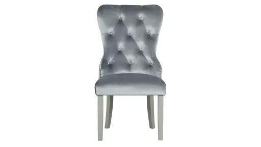 The Geneva Dining Room Features a Champagne Finish with Hints of Metallic Silver. Mirror Accents on the Server and Curio as well as the Table Make this Dining Room Shine. Chairs are Gray Velvet with Chrome Nailheads and Jeweled Tufted Backs that Add Even More Glam and Glitter to Your Dining Room. Matching Bench is available as a Seating Option.