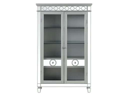 The Geneva Dining Room Features a Champagne Finish with Hints of Metallic Silver. Mirror Accents on the Server and Curio as well as the Table Make this Dining Room Shine. Chairs are Gray Velvet with Chrome Nailheads and Jeweled Tufted Backs that Add Even More Glam and Glitter to Your Dining Room. Matching Bench is available as a Seating Option.