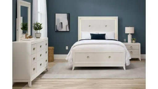 With retro style and a pop of glam, the Giovanna Bed is the star of a stunning bedroom ensemble. Round, metal disc hardware contrasts perfectly with the lustrous cream frame and swirl pattern on the headboard panel, while LED lighting adds drama and convenience. Combine it with other pieces in the Giovanna collection or enjoy it as a fabulous focal point on its own.