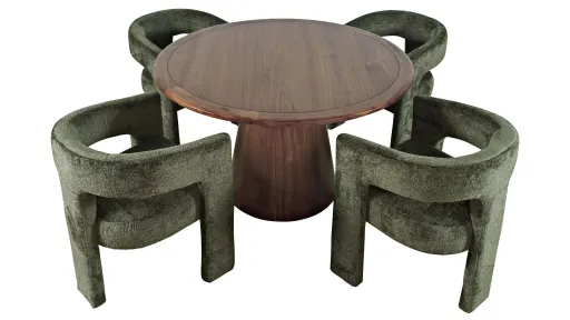 Upgrade your home with the stunningly beautiful Gwen Dining Set -5pc. The set includes four matching upholstered dining chairs with plush Jacquard fabric, and a 50 inch modern pedestal dining table. The rounded back with integrated arms offers both flexibility and functionality, making it ideal for use as an accent chair in your living room or as guest seating in your dining room. Crafted with a mid-century modern tapered base and a rich walnut brown finish, the dining table exudes sophistication and elegance. The minimalist design features an enticing curved silhouette that seamlessly blends modern simplicity with daily functionality, perfect for weekday dinners with family or game night with friends.