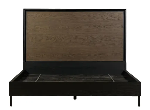 The clean, mid-century form of the Hadley King Bed adopts fresh depth via black-brushed oak casing and inset headboard of warm oak with beautiful natural graining. Two-tone contrast nods retro inspiration, while black iron legs add a hint of modernity.