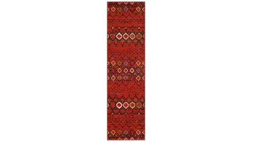 Expressive tribal patterns, etched in vivid hues and subtle highlights, accentuate the trendy design of these exotic Halen Red Runner Rug floor coverings. Power loomed from soft yet durable synthetic yarns for long lasting color and a comfort-soft feel underfoot.
