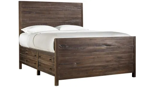 The rough and tumble Hanover California king storage bed features naturally roughhewn planks with heavy saw marks, pitting and wane. A 9-step finish uses glaze to highlight its wood grain with a light wash to simulate the patina of age.