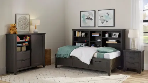 Keep nighttime essentials within arm's reach with the handsome Harley Nightstand featuring a nice combination of craftsmanship and functionality. A dark oak finish and integrated drawer pulls add a unique industrial edge to the look, while ball bearing glider tracks and English dovetail joinery on 3 drawers offer smooth and convenient usage.