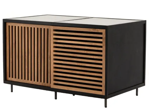 Linear-driven design. The Haverton kitchen island's clean casing of black mango wood frames warm natural oak, features both vertical and horizontal slats which create a crosshatch pattern when opened. A white marble top adds extra intrigue to this modern take on mid-century style.
