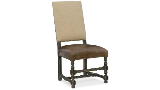 You will want to linger and gather for hours as you break bread or visit with family and friends in the Hill Country Comfort Upholstered Side Chair. The seat is upholstered in an aniline top grain leather, and the back is in a woven, desert-colored fabric, and both are accented with bronze nail head trim. The bobbin-style stretchers and legs add authenticity.