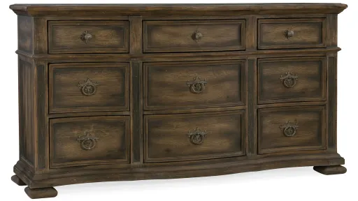 Fill your master or guest bedroom with character with this Hill Country nine-drawer dresser steeped in the rich heritage of the American countryside. Crafted of Hardwood and Poplar Solids with White Oak and Walnut Veneers, the dresser features a black drop-in felt liner in the left and right top drawers, a removable jewelry tray in the top center drawer with wood supports to rest the tray at the top of the drawer, and cedar-lined bottom drawers.