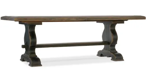 The Hill Country Rectangular trestle-style dining table, inspired by the bigger-than-life Hill Country of Texas, is crafted of flat-cut rustic white oak veneer for an authentic look of rustic elegance. With both 18-inch leaves, the table expands to 122 inches and seats up to 10 guests.