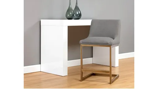 Holly Counter Stool a classic cantilever design for a touch of elegance. Crafted with a bold abbington burnt orange, zenith graphite Gray and zenith soft Gray fabric with a rustic bronze steel frame. Suitable for various dining, kitchen and bar spaces of all sizes.