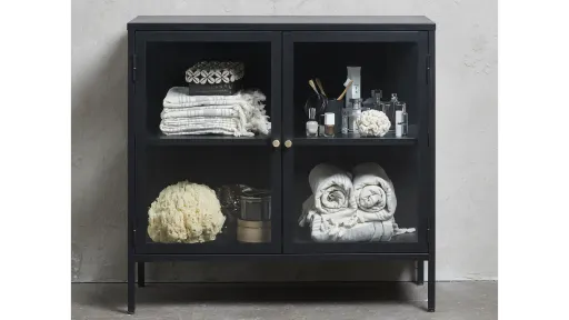 Enjoy a more refined take on the modern design aesthetic with the Hudson 2-Door Sideboard. This metal two-door storage cabinet is designed with two glass panel door fronts, one shelf, and a simple black metal framework, making it the perfect home for your favorite pottery, books, and other collected curiosities. The design is timeless and complements any range, color or texture so feel free to mix it up with both natural wooden colors, darker smoked stains and bold colors from fabrics or simply use it as a "stand-alone" statement piece.