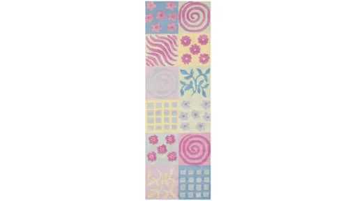 The Hukka Kid's Room features a colorful design with geometric shapes and flowers for a fun addition to your kid's room. These rugs are made with pure soft wool and hand-tufted to a cotton backing for added cushion.