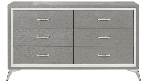 The Huxley Collection features a modern design with clean lines and a sleek finish. This six-drawer dresser offers ample storage space for your clothing and accessories. The top surface is perfect for displaying decorative items or a mirror. Crafted from durable MDF board, this dresser is built to last. Its neutral gray color and modern style make it a versatile addition to any bedroom decor.