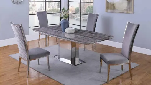 The Isabel Upholstered Chair- Set of 2 are elegant side chairs with a stunning high-back design. The velvet fabric upholstery is bordered on the back by the polished stainless-steel frame, making this a simple but still stunning addition to any dining space.