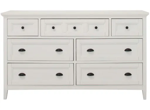A soft chalk white finish on pine veneers and solids creates a relaxed beachy feel in any bedroom with Ivy Ridge Dresser. It lends shaker appeal and provides storage. Straight legs support the straight-lined dresser with raised beaded trim for a touch of cottage style.