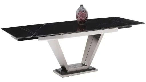 This Jessy Dining Table features a black 38"x 87" black Marquina marble top with two 12 self-storing pop-up extensions that open the table to 99" or 111". A V shaped pedestal base with brushed stainless steel tie the table together.