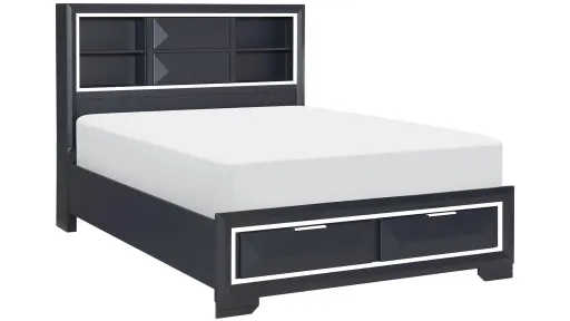 The modern design of the Jocelyn Bed creates a striking profile for your bedroom. The midnight blue finish is reflected by the chrome banding that defines the front of the bed. The hidden bookcase headboard and storage footboard proved additional functional storage space beyond a traditional case piece. Chrome pull hardware accents each of the raised drawer fronts.