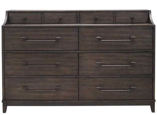 The serene and sophisticated Josephine dresser is sure to take your bedroom to the next level with its great-looking details. The clean-lined facade features two half-depth drawers atop six full-size drawers for unique character plus surface and storage space. Graceful curves and tapered feet, molding, and two styles of drawer hardware are some of the special touches in this top-notch bedroom collection.