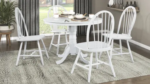 Kaydee 5-pc. Dining Set is traditional profile will complete the look you desire for your home. The traditional Windsor back chair that flanks the round tabletop, and pedestal base, lends a classic accent to the look of the collection, making it the perfect addition to your casual dining space. A white finish is utilized its hue a crisp palette perfect for your tabletop accessories.