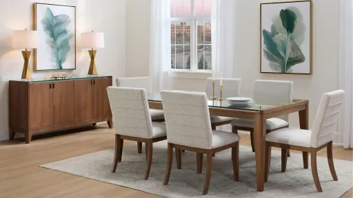 Embrace the minimalist modern grace of the Kerrigan 7-pc. dining set, featuring clean, tapered lines and a light walnut finish. The clear glass tabletop lets the natural beauty of the wood shine through, creating a sense of spaciousness and visual appeal. Add the unadorned splat-back chairs with 100% Polyester, and this setup fits the bill for a memorable dining experience.