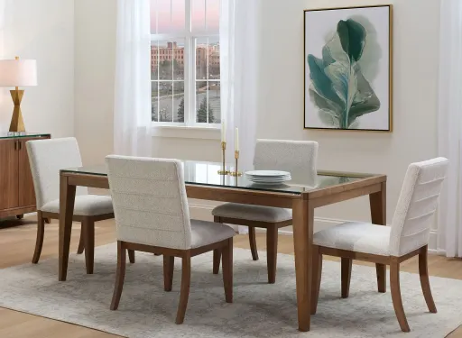 Embrace the minimalist modern grace of the Kerrigan 5-pc. dining set, featuring clean, tapered lines and a light walnut finish. The clear glass tabletop lets the natural beauty of the wood shine through, creating a sense of spaciousness and visual appeal. Add the unadorned splat-back chairs with faux leather seats, and this setup fits the bill for a memorable dining experience.