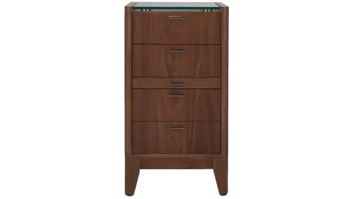 Low-profile design, glass topped surface, light walnut finish ... what more can we say about the Kerrigan nightstand? The first-rate craftsmanship and smart nickel hardware fit the bill with everything you want for a modern midcentury look. It also has four drawers and a super handy pullout shelf for maximum function.