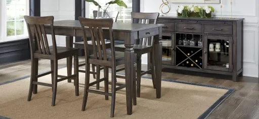 The Kingston 5-piece rectangular counter-height dining set with butterfly leaf evokes a timeless feeling of Colonial style and elegant simplicity. The understated, straight-lined profile combined with deeply distressed hardwood and finished in Dusty Black creates an appealing aesthetic for all your dining experiences. The table is masterfully crafted from solid hardwood and constructed with an 16 self-storing butterfly leaf and wooden glides to make entertaining easy and effortless. The case pieces in this set are accented with Matte Black hardware, articulated turned legs and slat back side chairs with contoured wooden seats for added comfort.