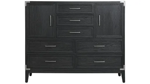 The Laguna Master Chest is offered in a wire-brushed multi-step glazed finish, in a complimenting Weathered Steel color. Special features include hardware with an antiqued pewter finish, and decorative metal corner brackets on all items. This collection also offers two unique items, a Floor Mirror and a Storage Bench; perfect items to round out any bedroom revamp!
