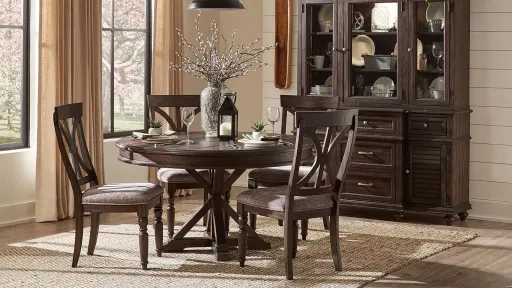 The solid transitional styling of the Larkin dining set creates an impactful design presence in your dining room. Utilizing distinct accent techniques - plank effect, rasping, saw marks - and pairing them with traditional framing and a rich finish - driftwood charcoal over acacia solids and veneers - creates a collection that is worthy of your dining room. 54-inch round pedestal base table allows for perfect placement within your space.