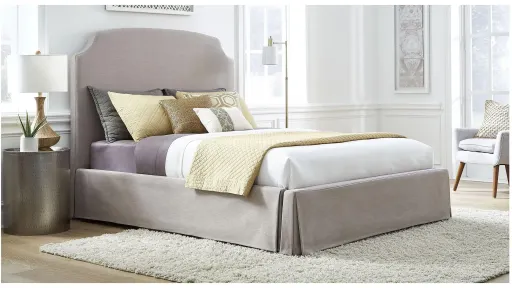 The Laure Upholsterd Skirted Full Panel Bed brings relaxed luxury to your bedroom. Made with solid wood framing, layered foam and soft linen-blend fabric, this group creates a no-maintenance slipcover look with skirted bases and inverted corner pleats. Available in panel, wingback, camelback and clipped corner configurations.