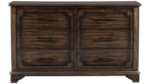 The rustic brown finish over acacia wood and veneer solidifies the rusticated design of the Leesa Dresser. Its rugged aesthetic and traditional lines create a versatile addition to your transitionally styled bedroom.