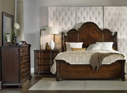 The striking, heirloom-quality Leesburg Poster Bedroom Set is elegantly shaped and displays exquisite swirl and cathedral mahogany veneers on the generously-scaled headboard. Crafted of Mahogany Veneers, the bed features a rich traditional mahogany finish with exquisite cathedral and swirl mahogany veneers with light physical distressing. Bed includes headboard, footboard and rails. Headboard can be used alone.