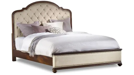 Leesburg Upholstered King Bed harkens back to an antebellum time when elegant traditional mahogany furnishings with graceful lines set the stage for Southern hospitality and grand occasions. The mixture of rich mahogany with the more casual antique white finish results in an unexpected twist on classic style with a fashion flair.