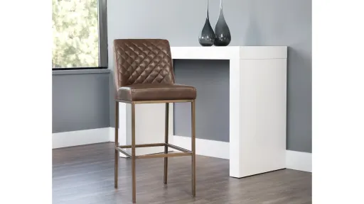 Leighland Barstool transform bar and dining spaces with this classic barstool. Stocked in light and dark grey fabric and havana dark brown, coal grey and overcast grey faux leather with diamond stitching on the interior seat back and an antique brass frame steel frame. Suitable for various dining, kitchen and bar spaces of all sizes. Handle With Care: This design has been crafted with faux leather. Faux leather is manufactured to reflect the natural characteristics of leather; as such, colour variations, markings, wrinkles, grooves, and light scratches are appreciated characteristics.