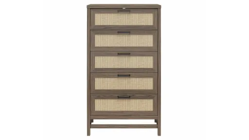 Clean up the clutter in your closet with the boho-chic Lennon Tall 5 Drawer Dresser by Ameriwood Home. The 5 drawers can store away t-shirts, socks, and jeans to free up space in your closet. Each drawer features durable metal slides for a smooth gliding drawer. Made of laminated MDF and particleboard, the warm brown woodgrain finish pairs with the faux rattan drawer fronts for a fun coastal look. A wall anchor kit is included to secure the Dresser to the wall and prevent tipping injuries. Assembly required.
