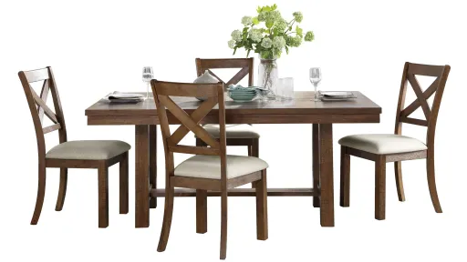 With its transitional style the Levittown 5-pc. dining set presents as the perfect addition to your casual dining room. Solid pine lays a foundation for the acacia veneer of the set, with a brown finish lending highlight to the distinct veneer pattern. The wood framed chairs feature a beige hued fabric seat.