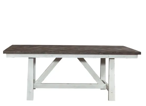 Liberty Trestle Table features a timeless heavy distressing, a fixed tabletop made of solid wood, and an "X" style trestle base. The two-tone white finish with wood tone tops creates a versatile look that is sure to be the perfect addition to any space.