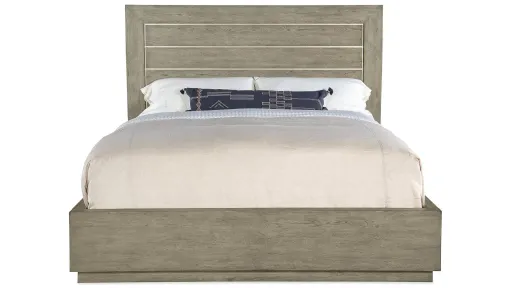 Capturing the essence of nature's organic color palette with antique pewter metal accents in the headboard, the striking modern silhouette of the Linville Falls King Panel Bed is crafted with oak veneers and finished in the soft smoked gray mink color.